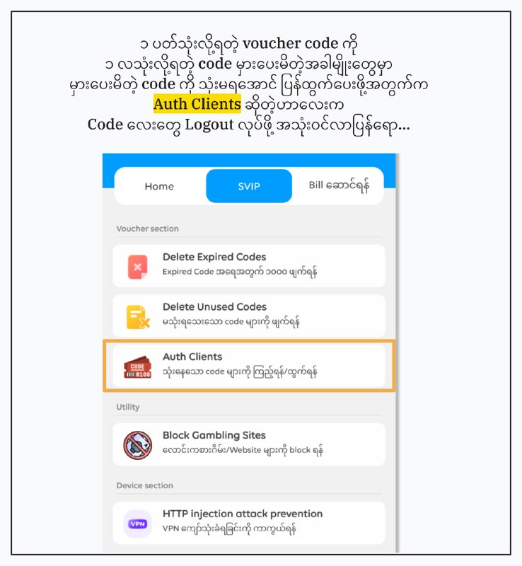 - ဝင်သုံးထားတဲ့ voucher code တွေကို logout လုပ်နိုင်ခြင်း