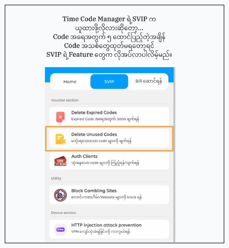 ( Bill ဆောင်တဲ့သူတိုင်းအတွက် Time Code Manager မှာ SVIP Member အဖြစ်ရရှိဦးမှာဖြစ်ပါသည်။ )